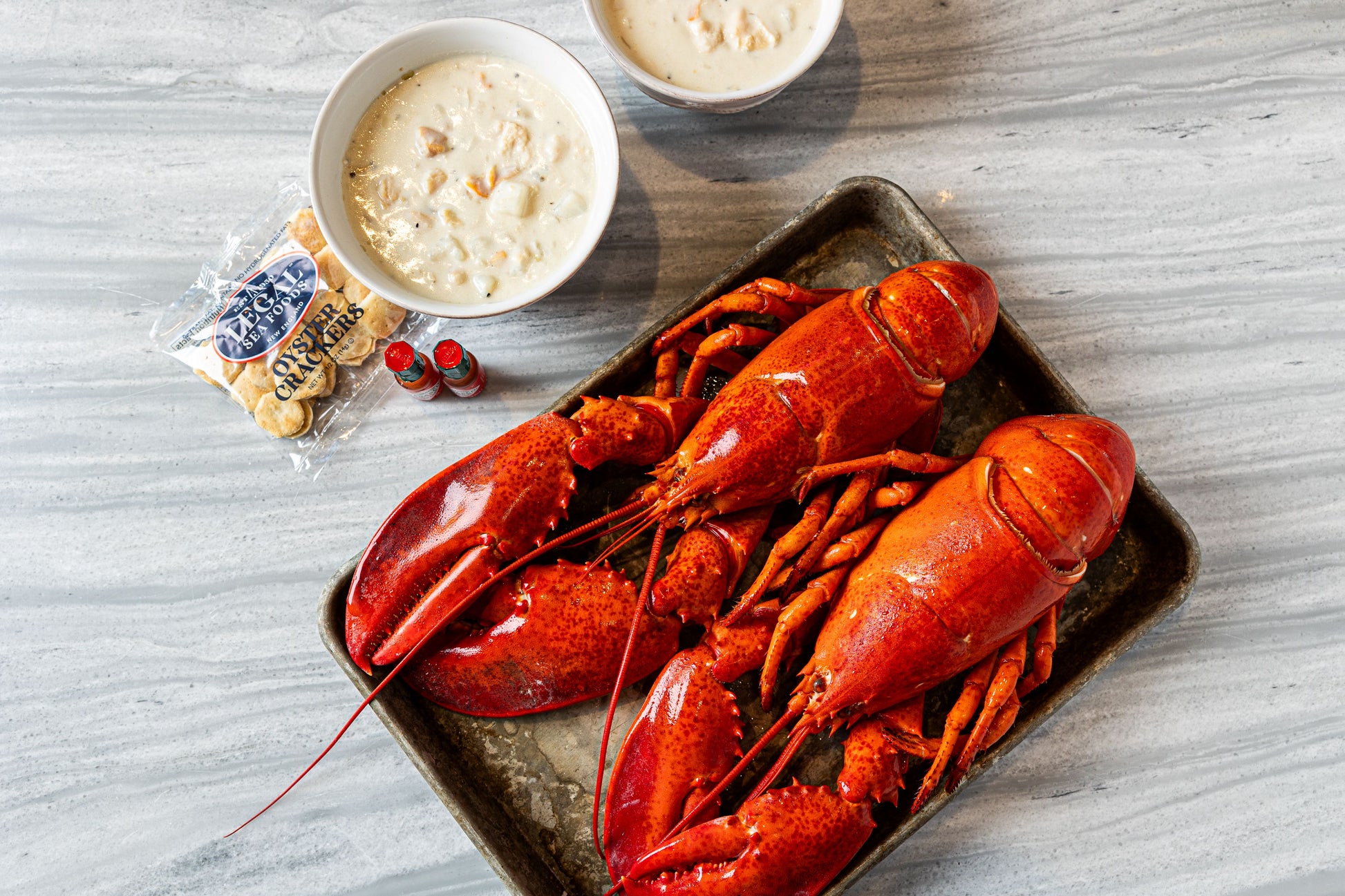 - Two 1.25 lb live lobsters